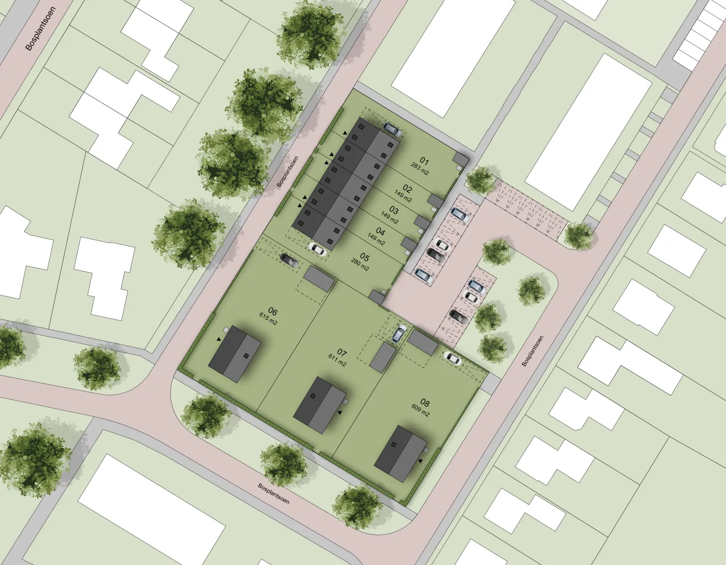 In het centrum van het dorp Zevenhuizen, aan de straat Bosplantsoen, verreizen acht nieuwbouwwoningen. Er worden vijf rijwoningen gerealiseerd en drie vrijstaande woningen op royale kavels. Alle woningen kijken uit op een brede groenstrook met riante bomen.