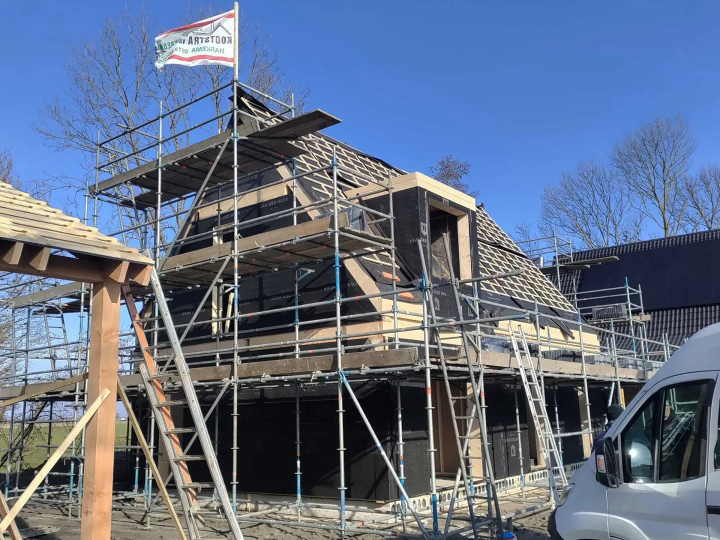 De bouw van deze woning gaat snel. Het houtskelet staat inmiddels en de vlag wappert al bovenop de woning, een feestelijk moment op de bouwplaats! Daarmee wordt steeds beter zichtbaar hoe de woning straks in het groene erf past.